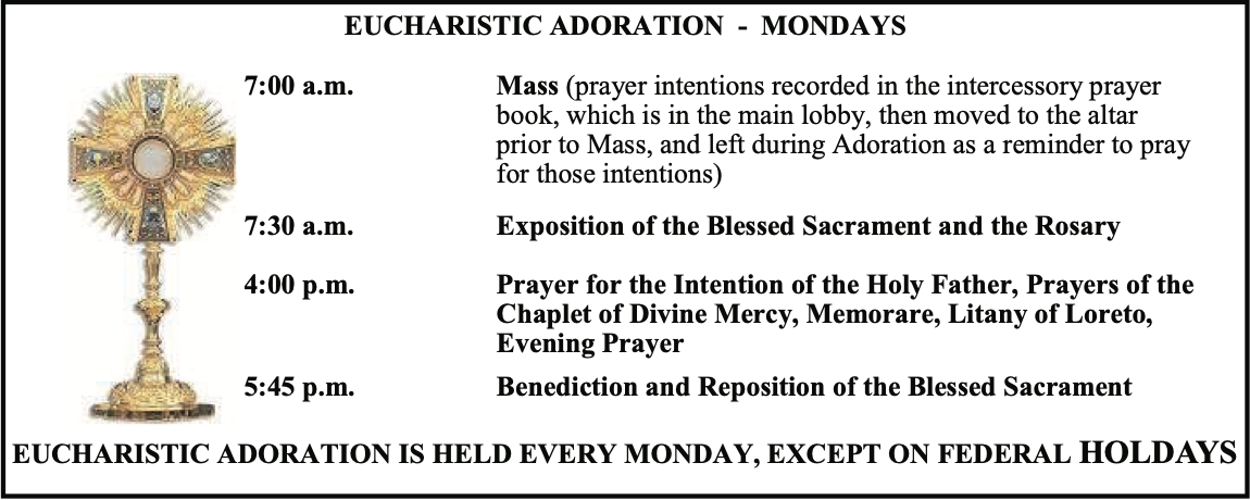 Please consider regularly dedicating one hour of your Monday for time with Jesus; available time slots are from 7 a.m. to 6 p.m. Otherwise, 10…15…30 minutes, whenever you can, no obligation, works, too. It is time well spent!