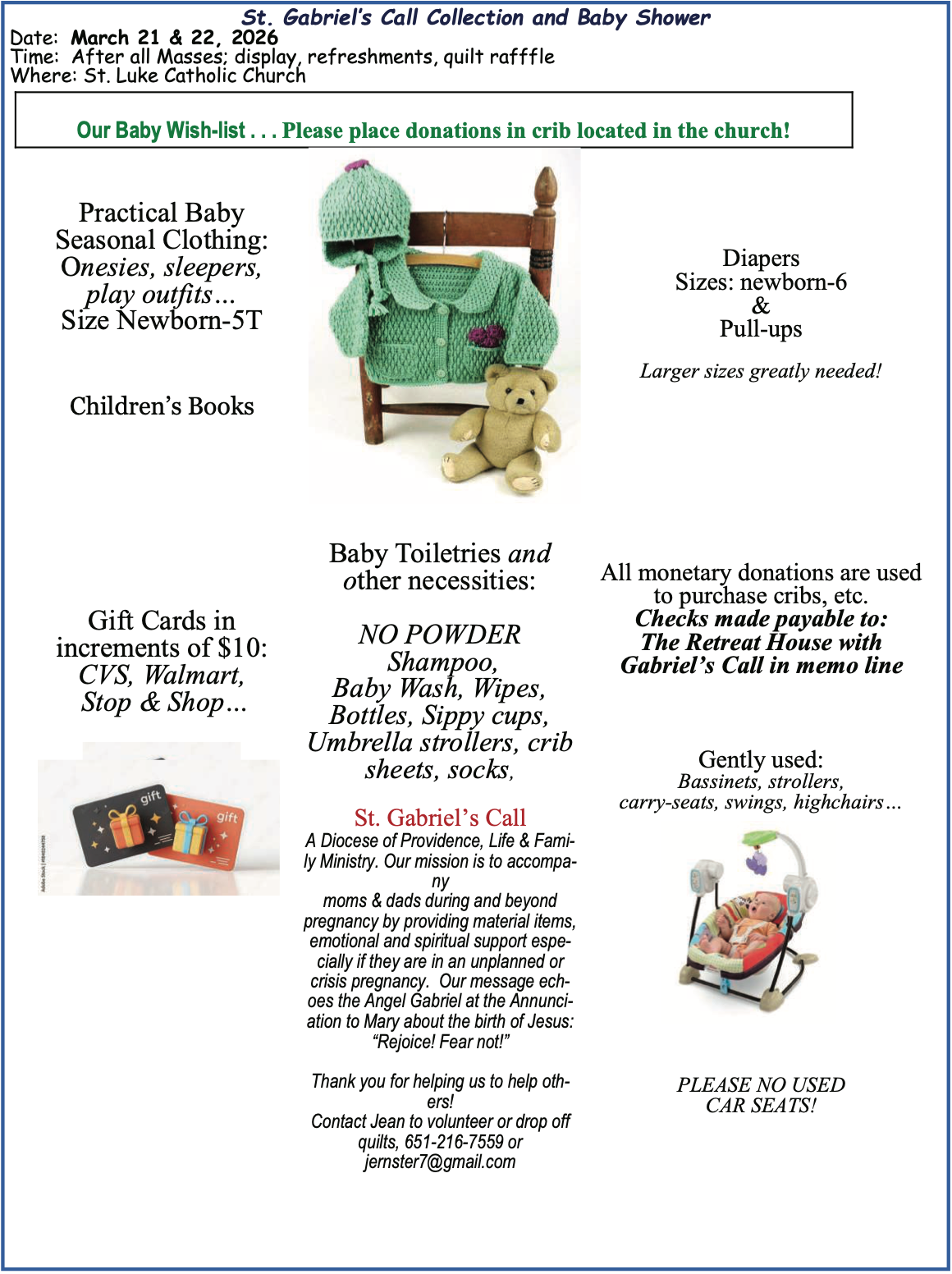 - 3/21-22: St. Gabriel's Call Baby Shower, St. Luke's Catholic Church